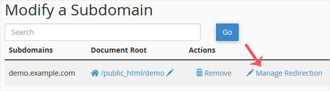 4. Click on Manage Redirection, which corresponds to the subdomain you wish to manage.