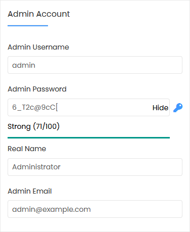 • Admin Username: Your new Bolt username (for security reasons, do not use the administrator or the admin username).